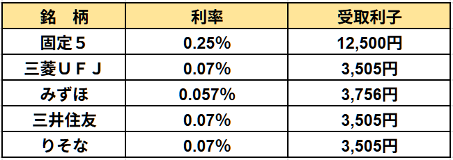 しかも受け取り利子の合計については、固定5は単利、主要銀行は複利で計算した結果です。