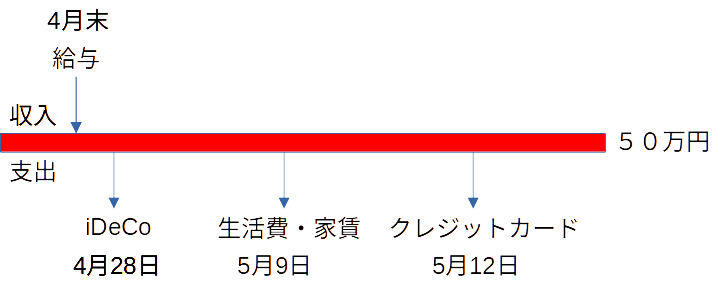 簡単な図にすると上記のとおりなんですが、毎月10日にクレジットカード代金が引かれて1か月の収支が決まります。