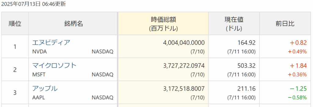 エヌビディアの時価総額は7月13日時点で4兆ドル超え。
