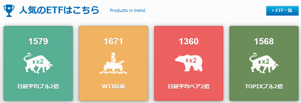 人気のETFとして示されていたのが、「日経平均ブル2倍」とか「日経平均ベア2倍」「WTI原油」など。