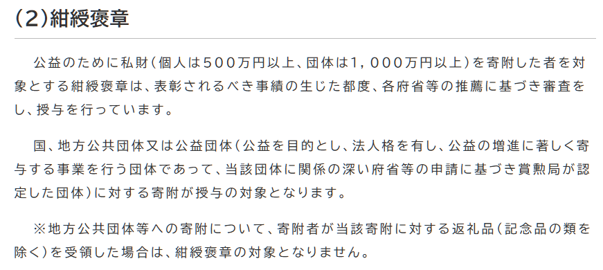 紺綬褒章の公益団体認定を受けた特定の団体に寄付をすると、その団体が「この人は立派だから褒章をあげて!」って推薦してくれます。