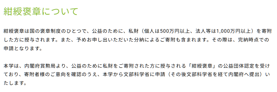 例えば、認定団体である「横浜市立大学」の紺綬褒章についてのページに行くと、500万円以上を寄附すれば授与できると記載されています。