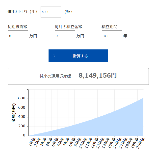 - 元本:2万円 × 12ヶ月 × 20年 = 480万円