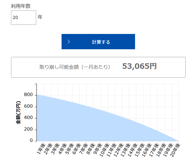 これを積立期間と同じ20年間にわたり、毎月一定額を取り崩した場合の計算では、