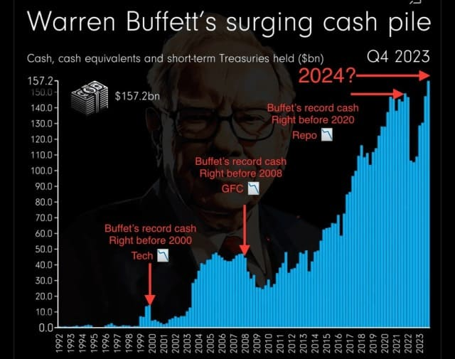 過去の大規模な株価暴落の前に、バフェットは多額の現金を積み上げていました。
