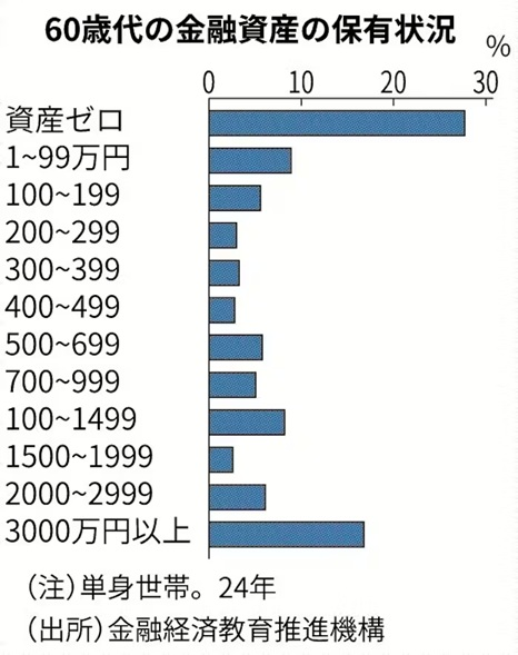 日本経済新聞が引用する金融経済教育推進機構(J-FLEC)による2024年の調査では、60歳代の単身世帯のうち金融資産ゼロは27.7%あり、200万円未満は何と42%に増えています(図表も同紙から)。