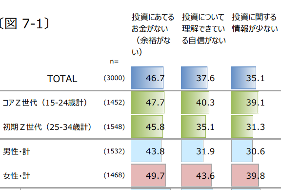 Z世代(15-34歳)の半数近くが「投資にあてるお金がない(余裕がない)」と回答しています。