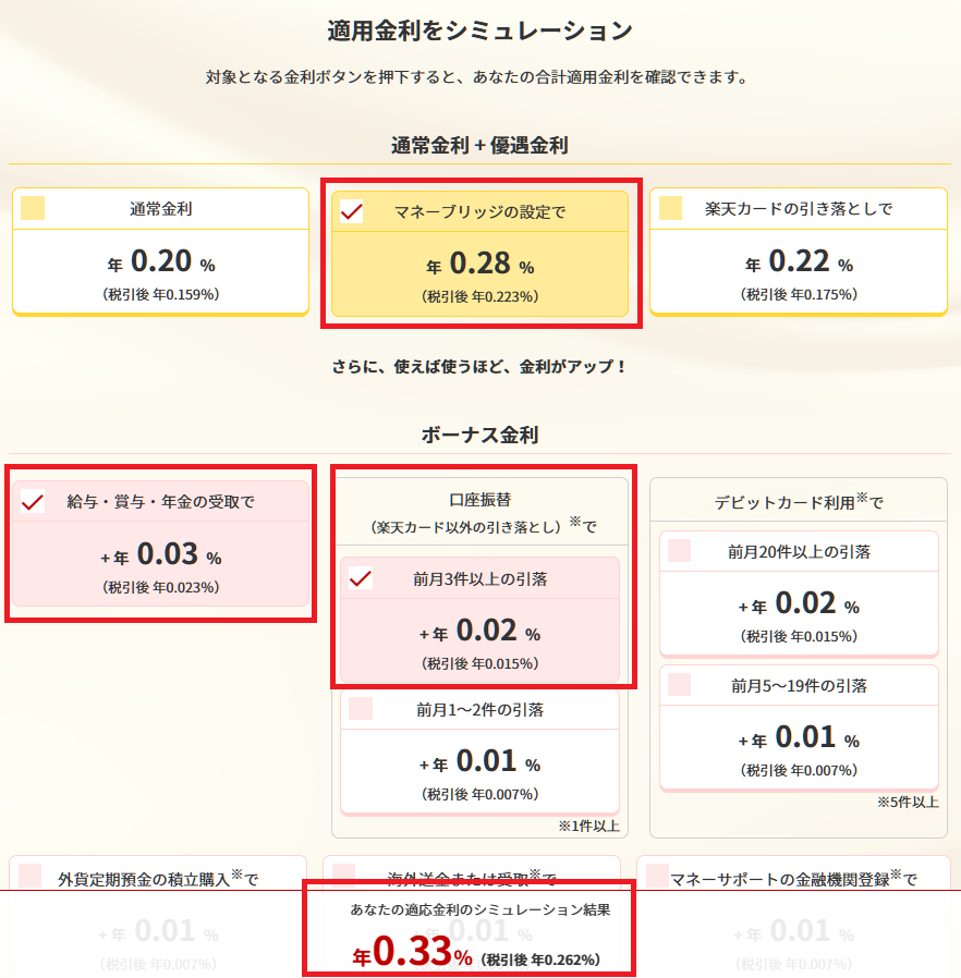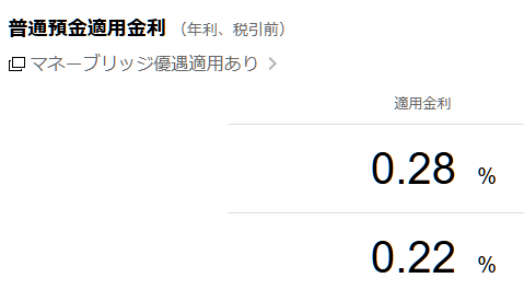 私の場合は「マネーブリッジ設定」と「ボーナス金利」で0.33%の金利になっているみたいです。