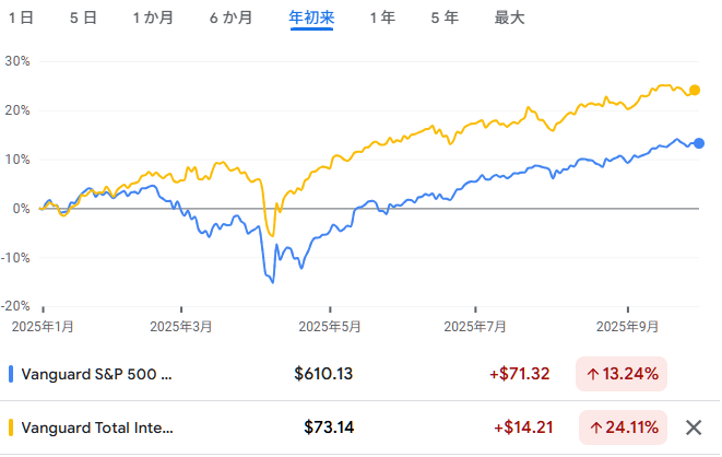 米国株(VOO:S&P500)と全世界株(米国除く)(VXUS)をの年初来の比較です。