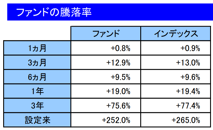 「設定来」の欄を見ると、ファンドは +252.0%、インデックスは +265.0%。
