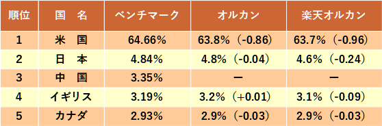 また注目したいのが、オルカンと楽天・プラス・オールカントリーの国別比率がほぼ一致してきたこと。