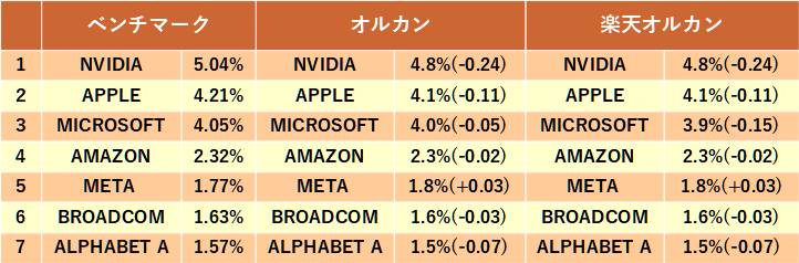 とはいえ、個別銘柄の構成比率を見てもオルカンと楽天・プラス・オールカントリーの違いはほとんどないのが分かります。