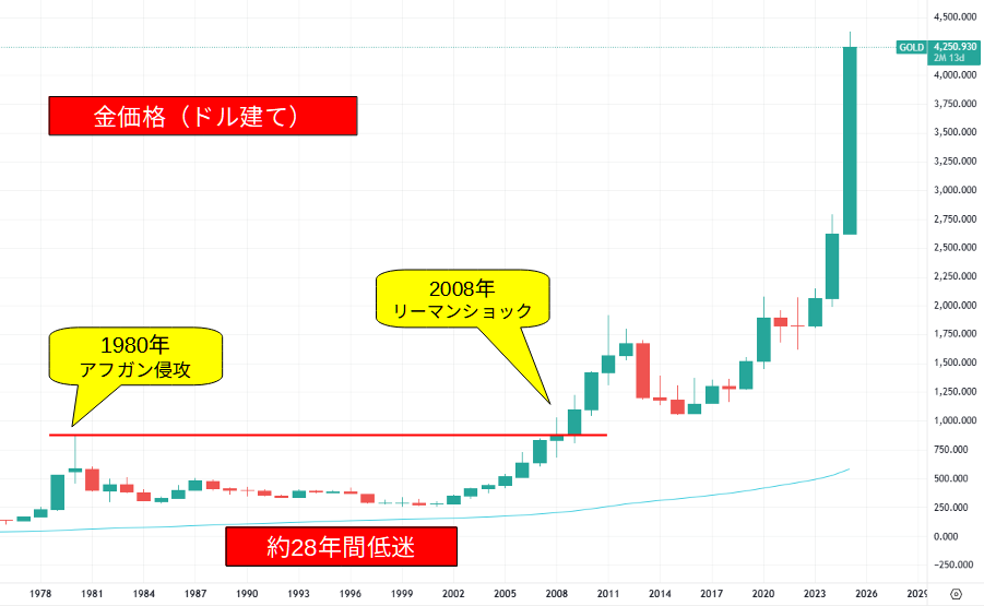 この間、金を保有していた人はまったく報われなかったということに…。