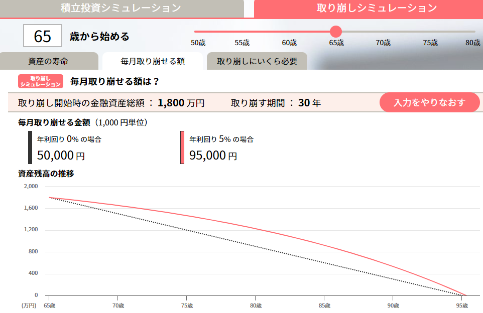 セゾン投信のシミュレーションによると、27年1か月後(92歳)に資産がゼロになります。