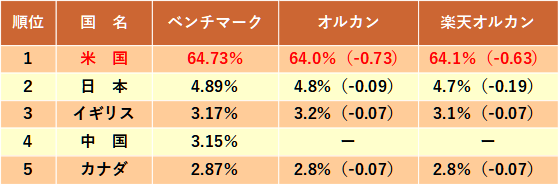 また、オルカンと楽天・プラス・オールカントリーの上位5位までの比率がまったく同じです。