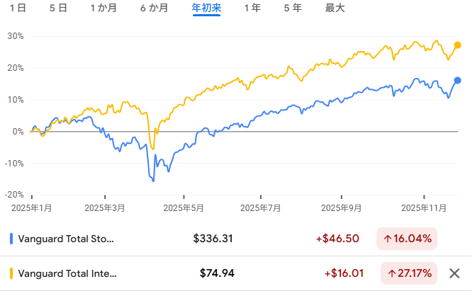 今年だけで見るなら米国株のみに投資するよりも、他国も含めた全世界株に投資したほうが上昇していますね。