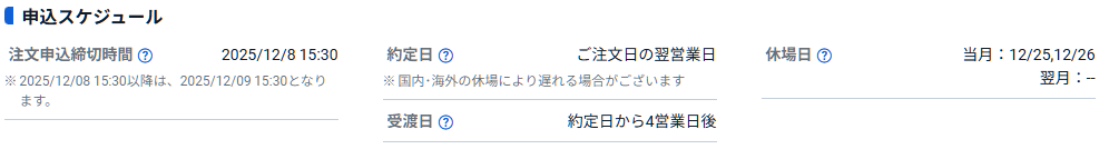 もし16:00に注文を出したとすると、翌営業日の12月9日(火)が注文日となります。