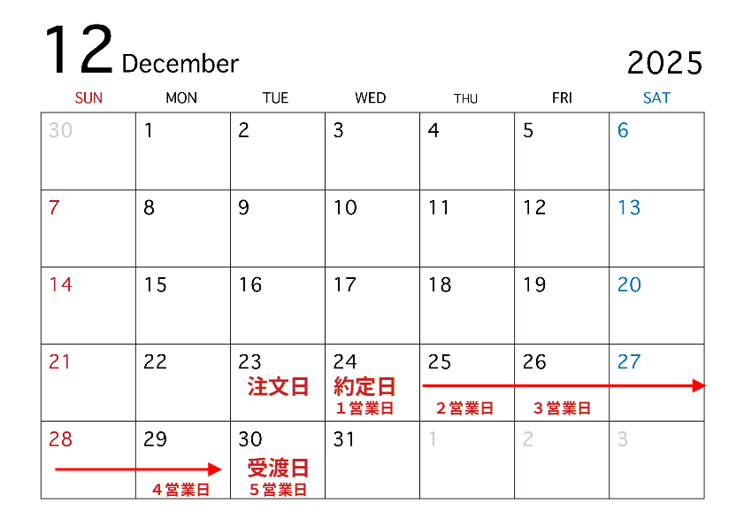 オルカンの場合、12月は25日、26日が休場日ですので、この2日間に注文した場合は翌営業日である29日(月)が注文日になります。