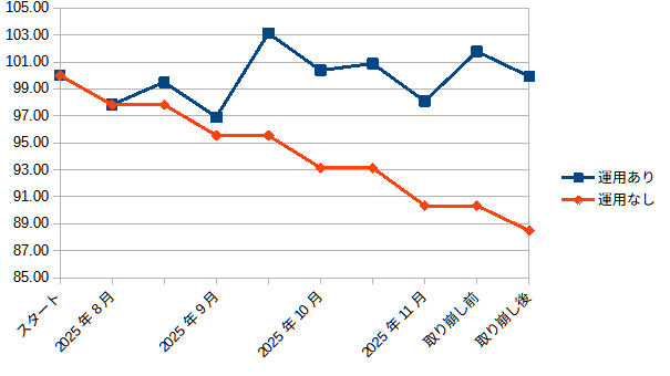 グラフにすると、青が「運用あり」、赤が「運用なし」。