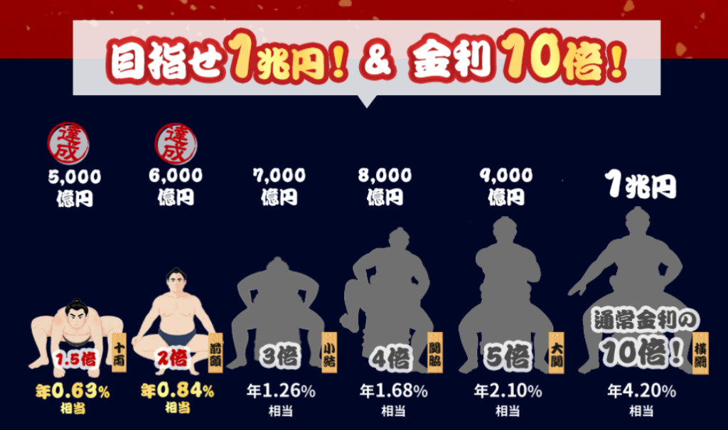 SBI新生銀行の今回のキャンペーンは、SBIハイパー預金の預金残高の達成額によって金利が上昇していく仕組みです。