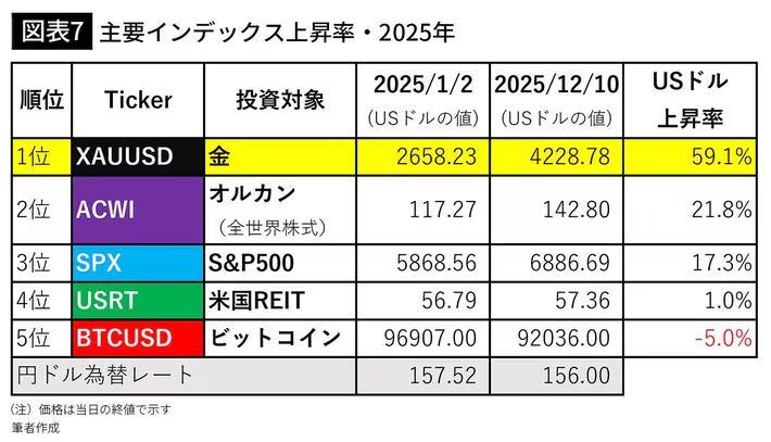 取り上げたのは、米国株価指数のS&P500、オルカン(全世界株式)、金、ビットコイン、米国REITの5つである。