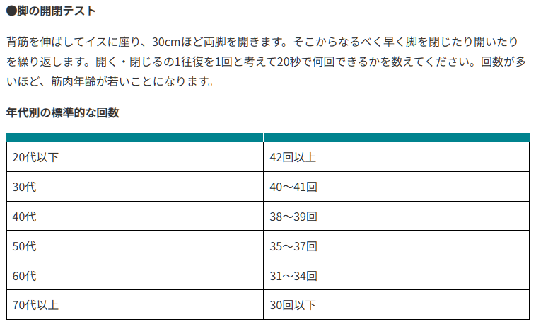 こちらのサイトに簡単に筋肉年齢をチェックできるテストがありました。