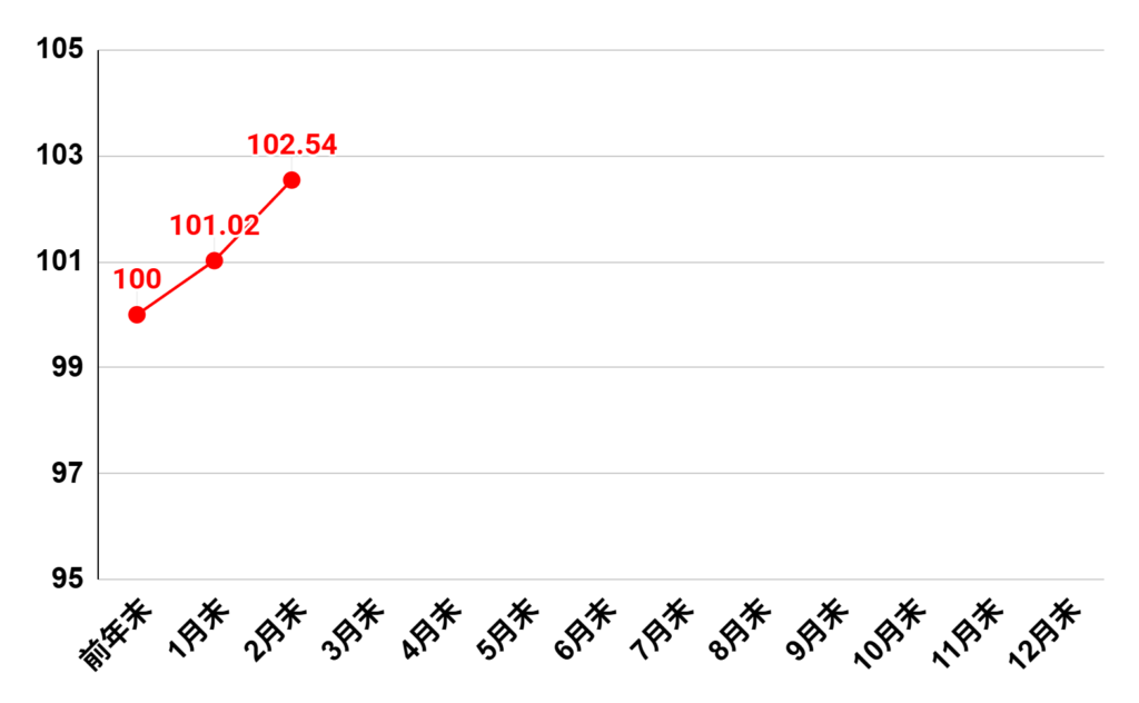1か月単位の指数は、昨年末と比較して102.54になりました。