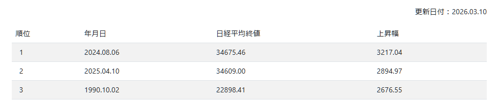 歴代1位となった2024年8月5日の下落に対して、日経平均株価が最も上昇した日はいつだと思いますか?