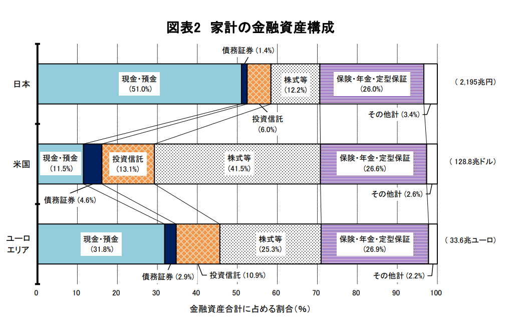 これに対し、米国では約55%、ユーロ圏では約36%が株式・投資信託で運用されています。