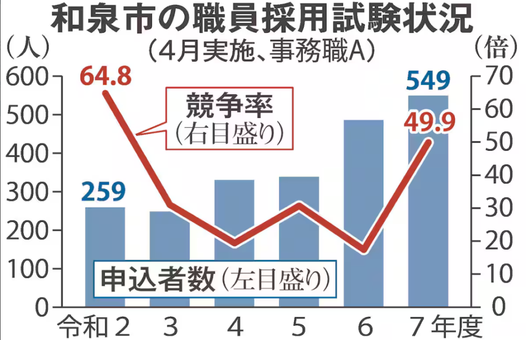 この和泉市では、採用試験の競争率が約50倍に達しているとのこと。採用予定11人に対して549人が応募し、競争率は約49.9倍。